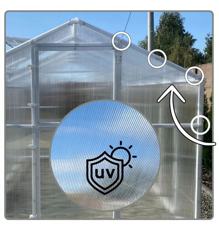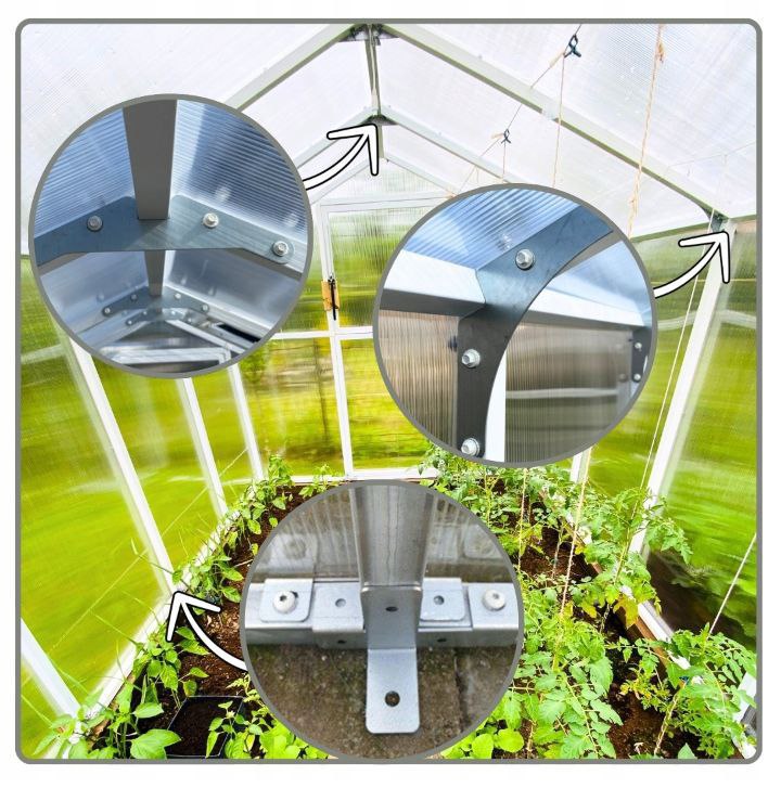 Łączenie – to nie tylko wytrzymałe szybkozłączki, które po skręceniu nadają stabilności szklarni ale i zastosowanie dodatkowych wzmocnień w ilości aż 15 sztuk. Wzmocnienia mocowane w szczycie dachu oraz w miejscu łączenia ściany dachowej oraz bocznej są wykonane z blachy ocynkowanej 2mm.