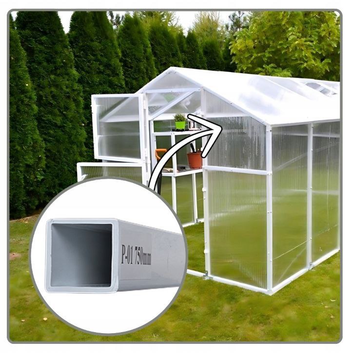 Profil PCV zamknięty 30x30mm o grubości ścianki 1,5mm oraz profil stalowy zamknięty 30x30mm o grubości ścianki 1mm– to dzięki profilom zamkniętym oraz zastosowaniu odpowiedniej grubości ścianki szklarnia zyskuje swoją odporność na niekorzystne warunki atmosferyczne takie jak śnieg czy wiatr.